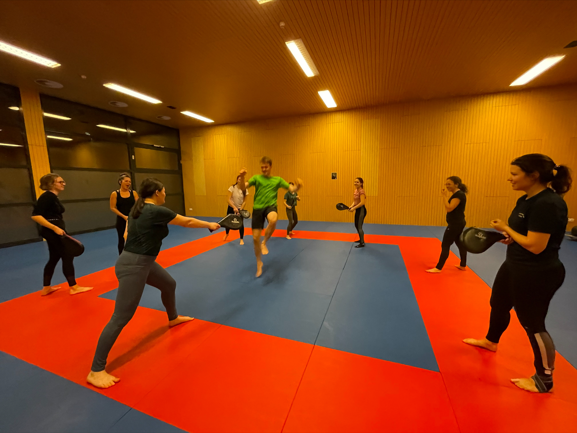 Im ersten Teil des Trainings kommen wir zur Ruhe und Gelassenheit bei Atem-, Dehn-, Haltungs- und Fallübungen.