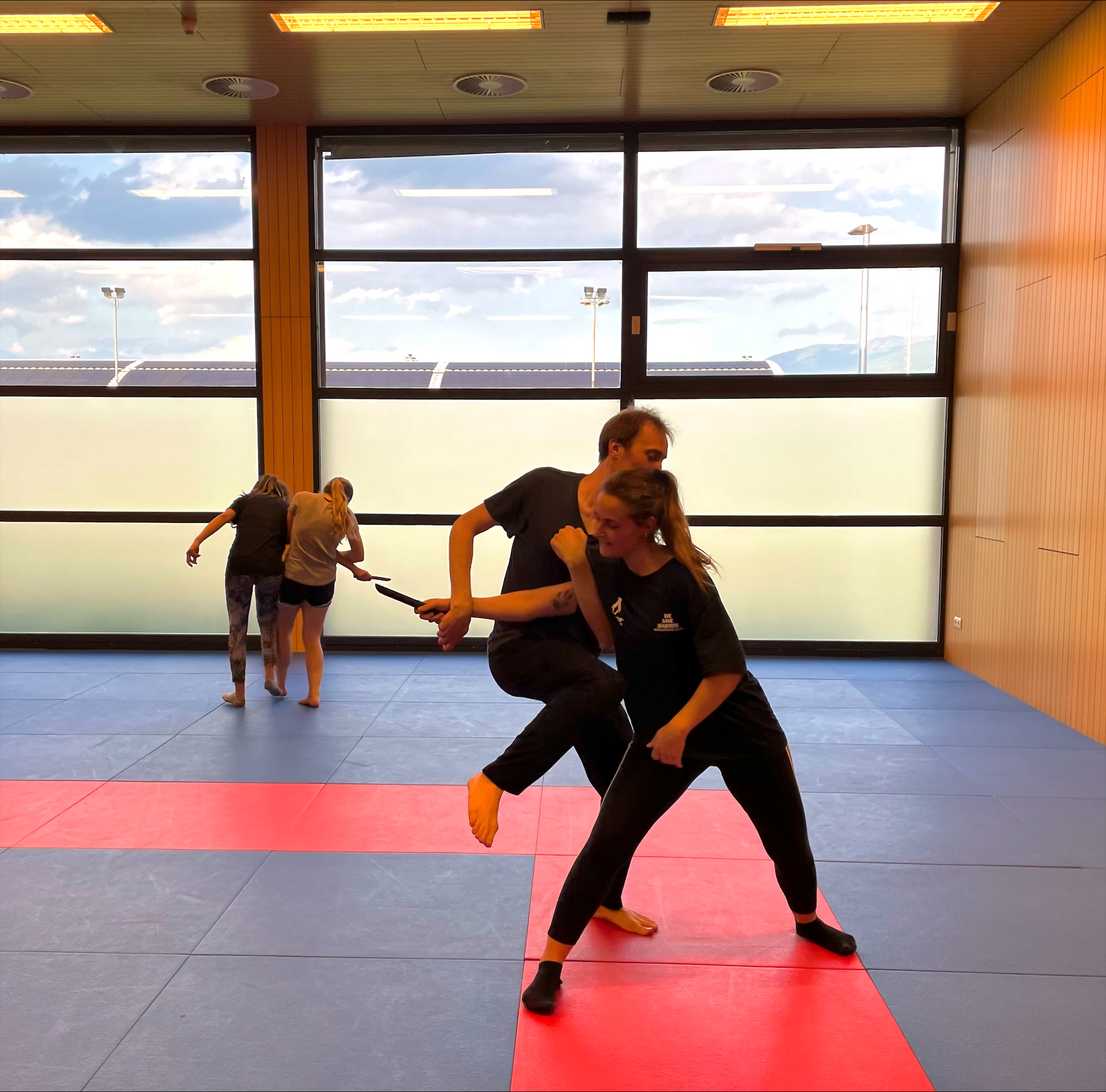 Im zweiten Teil lernen wir auf unterschiedliche Angriffe zu reagieren, unsere Gegner zu Fall zu bringen und sie am Boden zu fixieren, ohne zu verletzen. Dadurch, dass wir deren Energie nutzen, ist keine Kraft notwendig. Durch das Üben mit Waffen, wie Stock oder Messer, werden Distanz, Aufmerksamkeit und Präzision geschult.