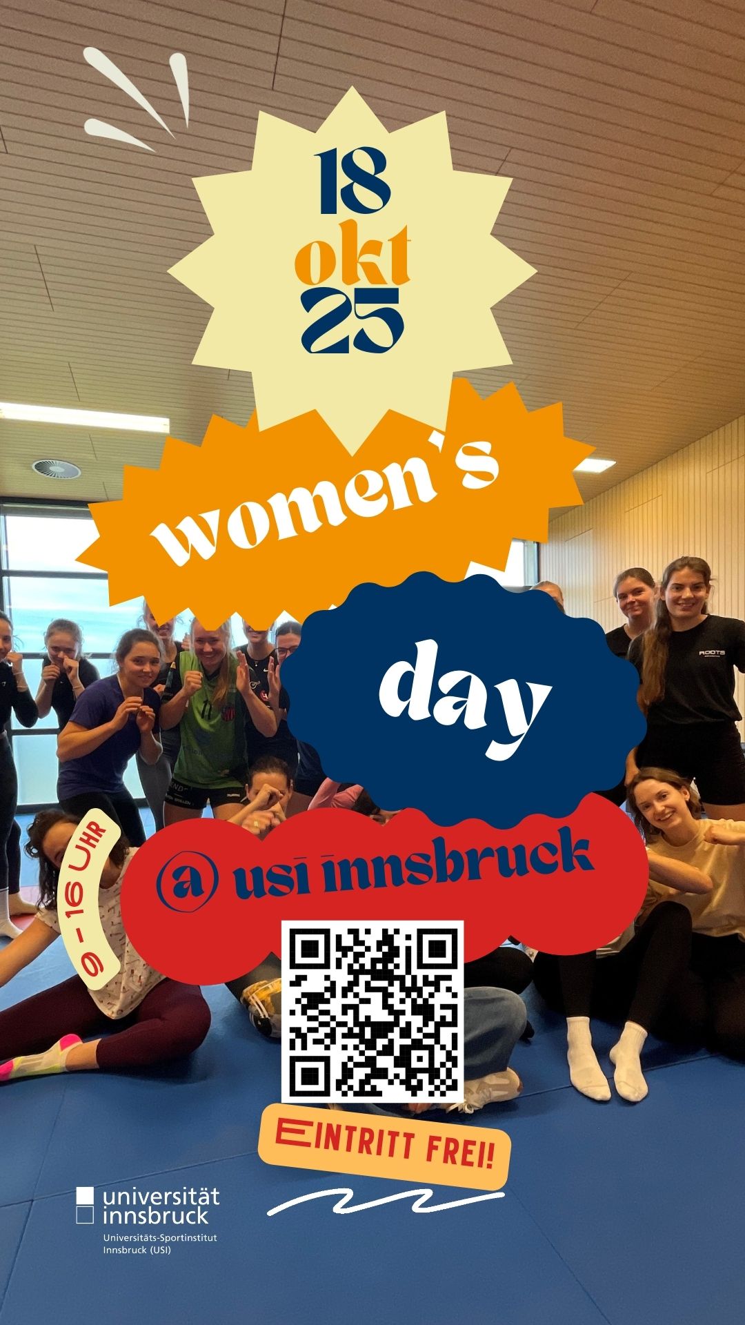 Wir gehen in die 3te Runde! Am Samstag, den 18.10.2025 ab 09.00 Uhr hält das USI Innsbruck ein buntes Programm für alle Mädels, Damen, Mamas, Sportlerinnen und auch Nicht-Sportlerinnen bereit! Du hast Lust neue Sportarten kennenzulernen? Du würdest dich gerne einem Sport-Team anschließen? Du möchtest dich mit gleichgesinnten Frauen zusammentun und sportlich (wieder) durchstarten? Du nimmst dir schon lange vor sportlich aktiv zu werden? --> hier kommt deine Gelegenheit: Die 3. Ausgabe des USI Women's Day! Das Programm: 09.00 Uhr | Treffpunkt & Get-Together bei gesunden Snacks & Getränken 09.30 - 12.30 Uhr | Padel, Gewichtheben, Fechten, Rugby 12.45 - 13.45 Uhr | Vortrag zum Thema "Ernährung & Sport" inkl. "Snack-Prep Workshop" (MZS) 14.00 - 15.30 Uhr | Unterwasserrugby und Schwimmtechnik Wir bitten um Vorab-Anmeldung per Mail, um das Teilnehmer:innen Interesse abzuschätzen: usi@uibk.ac.at Tarif 1: 0,00 € | Tarif 2: 0,00 € | Tarif 3: 0,00 € | Tarife